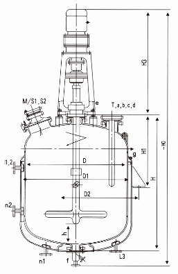 搪玻璃反应器除反应罐外,还有传动装置、搅拌加热(或冷却)、结构示意图如下: